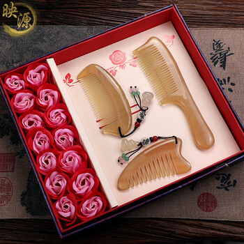 映源高端黄牛角梳子教师节礼物女士专用长发梳子情人节七夕礼物送女友老婆生日节日礼品 三件套 多功能款